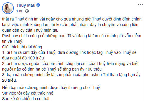 "Thật ra Thuỷ định im vài ngày cho qua nhưng giờ Thuỷ quyết định đính chính lại là việc mình không làm thì không cần phải nhận, đây là chuyện vô cùng liên quan đến công việc của Thuỷ hiện tại.