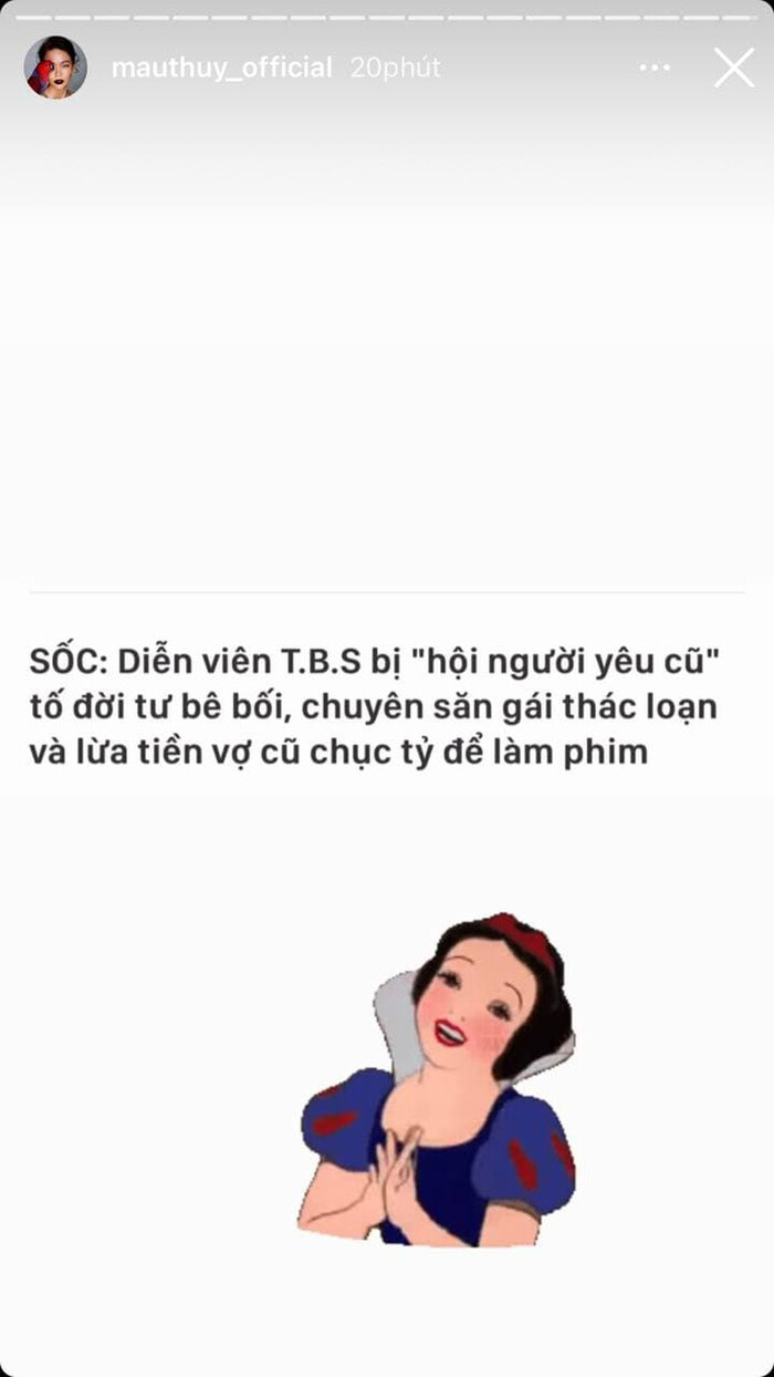Sau khi các bài viết đưa tin về T.B.S, Á hậu Mâu Thủy cũng đã có động thái. Nữ người mẫu chia sẻ lại tựa đề của bài viết về diễn viên T.B.S. Kèm theo đó, Mâu Thủy còn cài thêm hình ảnh nàng Bạch Tuyết vỗ tay cười tưới trước thông tin này.