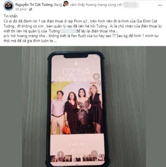MC Cát Tường mới đây đã đăng bài trên trang cá nhân để tìm chủ nhân thất lạc của một chiếc điện thoại. Trong đó, điều đáng chú ý nhất là hình ảnh của cô cùng gia đình được chọn làm ảnh nền của chiếc điện thoại này.