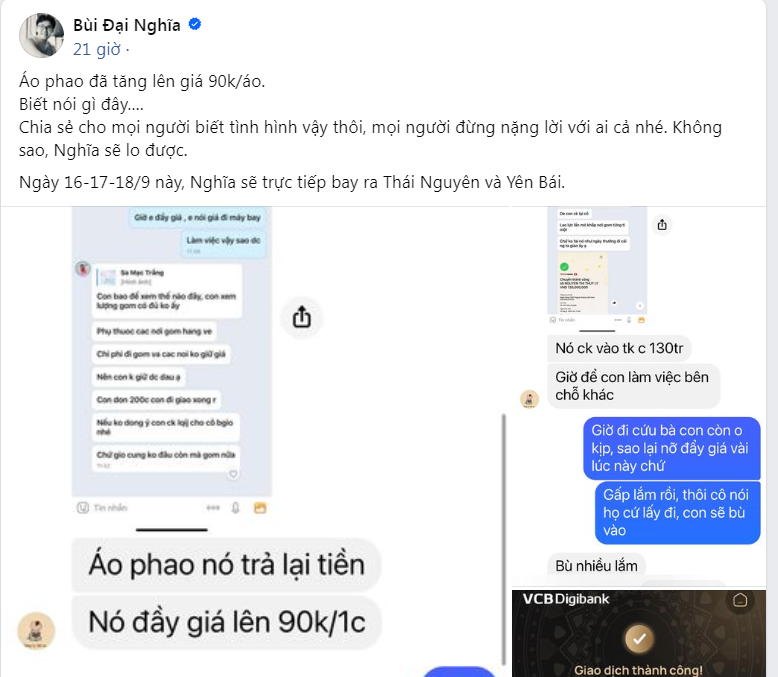 "Áo phao đã tăng lên giá 90 nghìn/áo. Biết nói gì đây... Không sao các bạn ơi. Nghĩa và một số bạn bè của mình vẫn lo được, nên đừng ai nặng lời với ai nhé. Ngày 16-17-18/9 Nghĩa sẽ bay ra Hà Nội rồi đi thẳng lên Thái Nguyên, hôm sau sẽ ở Yên Bái. Mỗi nơi trước mắt Nghĩa dự định sẽ trao 300 phần gồm chút nhu yếu phẩm và tiền mặt. Nếu từ giờ đến lúc đó nhắm đủ khả năng thì sẽ tăng thêm số lượng. Tuy không quá nhiều nhưng sẽ cố gắng trong khả năng của mình", Đại Nghĩa chia sẻ.