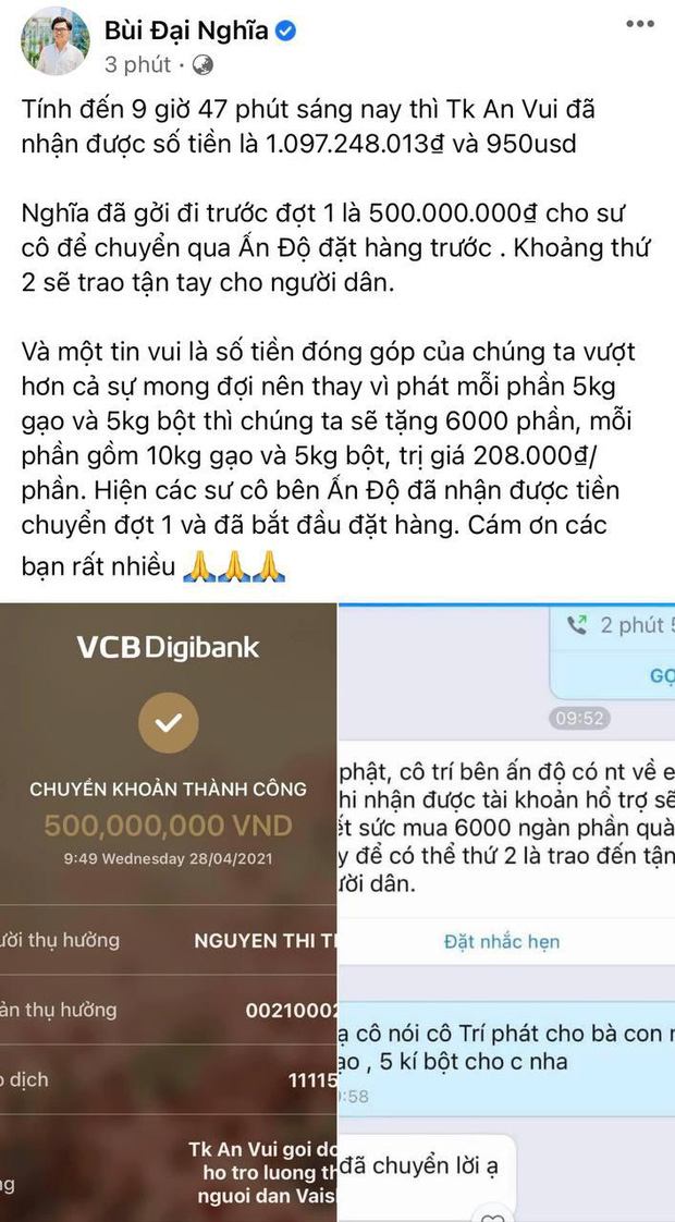 Giữa lúc người dân Ấn Độ đang rơi vào khủng hoảng, MC Đại Nghĩa đã thể hiện tinh thần tương thân tương ái khi đứng ra kêu gọi giúp người dân nước bạn. Sau hơn 1 ngày đứng ra nhận ủng hộ, sáng ngày 28/4, MC Đại Nghĩa công khai số tiền được người dân Việt Nam đóng góp đã lên đến hơn 1 tỷ đồng. Nam MC sẽ gửi một sư cô người Việt đang ở Ấn Độ để mua gạo, bột mì giúp cứu đói cho người dân tại đây.