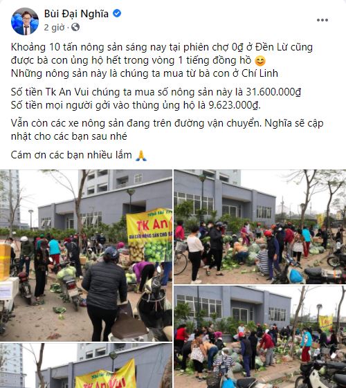 Đến sáng ngày 23/2, MC Đại Nghĩa cập nhật rất nhiều tin vui trên trang cá nhân, cho biết đã giải cứu được 20 tấn nông sản, thu về gần 30 triệu đồng chỉ trong vòng 1 giờ đồng hồ. Nhìn khoảnh khắc người dân Hà Nội tập trung từ sáng sớm để mua hàng và gửi tiền đóng góp giúp người nông nhân ở Hải Dương, nam MC vô cùng xúc động. Bên cạnh đó, MC Đại Nghĩa cũng tiết lộ sẽ tiếp tục hỗ trợ vật tư y tế cho các bệnh viện: "Trong hôm nay sẽ gửi 1000 bộ đồ bảo hộ phòng dịch cho 3 bệnh viện ở Chí Linh. Ngày mốt chúng ta sẽ tặng 2000 phần quà cho bà con Chí Linh. Mỗi phần gồm 1 thùng mì và 20 quả trứng (trứng là chúng ta cũng thu mua của bà con luôn, tất cả là 40.000 quả)".