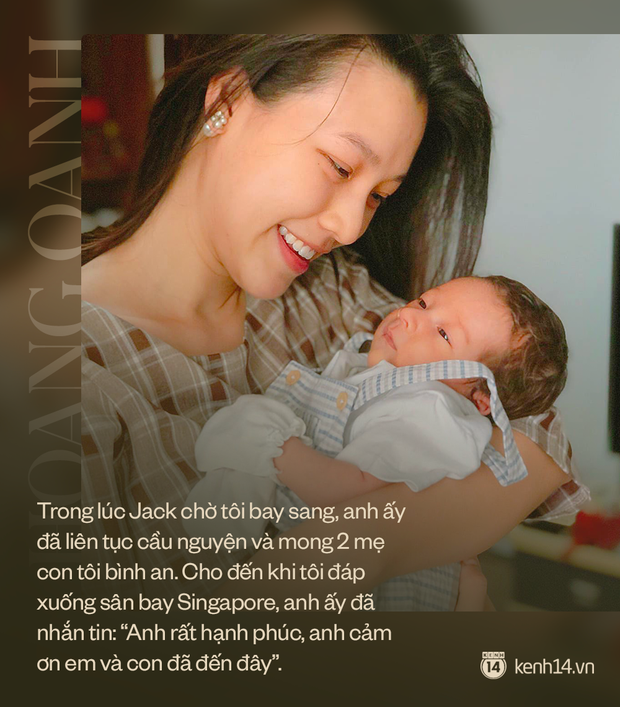 Lúc Hoàng Oanh nói về dự định sẽ bế con sang, anh Jack rất vui nhưng vợ chồng không dám nói gì nhiều với nhau. Trước đó chúng tôi đã bị vỡ kế hoạch nhiều lần lắm rồi nên đợt này không dám hy vọng, sợ bị hụt hẫng lần nữa. Trong lúc Jack chờ tôi bay sang, anh ấy đã liên tục cầu nguyện và mong 2 mẹ con tôi bình an. Cho đến khi tôi đáp xuống sân bay Singapore, anh ấy đã nhắn tin: "Anh rất hạnh phúc, anh cảm ơn em và con đã đến đây".