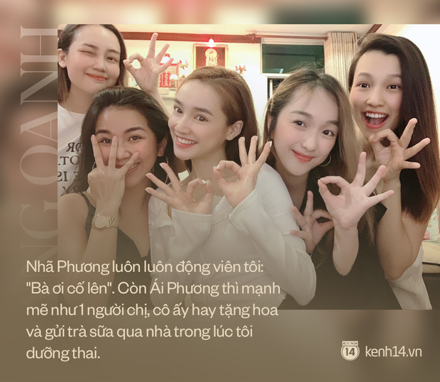 Trong hội bạn của tôi chỉ có Nhã Phương và 1 người bạn nữa đã có con nên họ thấu hiểu. Nhã Phương luôn luôn động viên tôi: "Bà ơi cố lên". Còn Ái Phương thì rất mạnh mẽ như 1 người chị, cô ấy hay tặng hoa và gửi trà sữa qua nhà trong lúc tôi dưỡng thai.