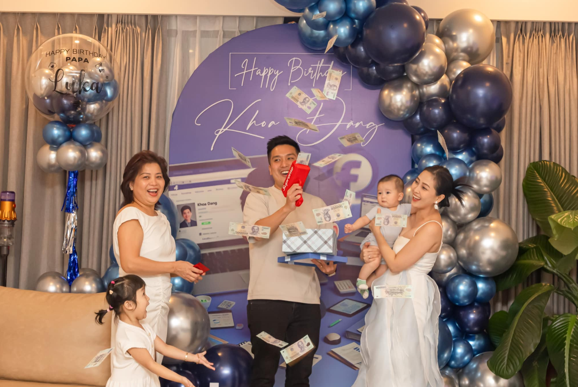 Để gia tăng độ bất ngờ, nữ MC còn có thêm nhiều tiết mục đặc biệt. Trong đó đáng chú ý là dùng súng đồ chơi để bắn ra rất nhiều tờ tiền mệnh giá 500 nghìn đồng. Rõ ràng, ông xã Anh Khoa đã rất thích thú trước bữa tiệc sinh nhật này từ vợ.