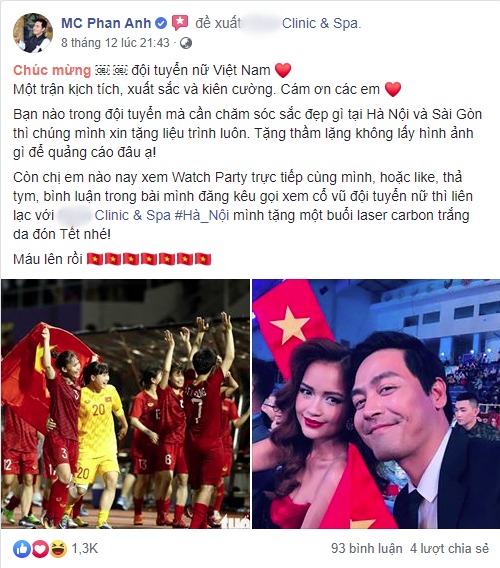 Cộng đồng mạng phản ứng gay gắt vì MC Phan Anh lợi dụng tên tuổi đội tuyển bóng đá nữ để PR lộ liễu, tuyên bố rằng "Bạn nào trong đội tuyển cần chăm sóc sắc đẹp tại Hà Nội và Sài Gòn thì chúng mình xin tặng liệu trình luôn, thầm lặng không lấy hình ảnh gì để quảng cáo" nhưng lại post status công khai rầm rộ trên trang cá nhân.