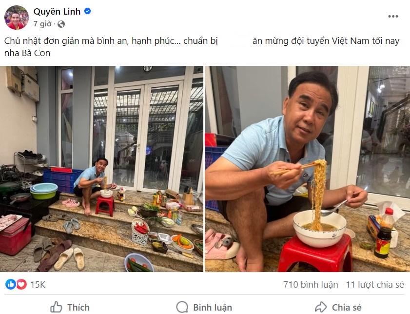 Mới đây, MC Quyền Linh đã gây chú ý khi đăng tải hai bức ảnh chụp lại cảnh anh ngồi ăn mì một mình trước cửa nhà nhân ngày nghỉ cuối tuần.