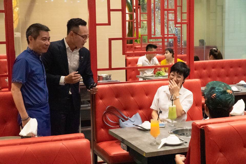 "Trong khi mình đang chăm chú nhìn điện thoại vì vừa khoe chuyện con đón đi xem trên facebook, một cốc nước ổi đặt trước mặt, mình ngạc nhiên vì chưa gọi gì, với ăn buffet tự đi lấy chứ! Và sửng sốt khi trước mắt mình là anh Lý! Anh Lý phục vụ bàn! Thấy hai bố con toe toét nên mình nghĩ chắc hôm nay anh Lý có show gì ở đây nên Tít rủ mẹ đến.