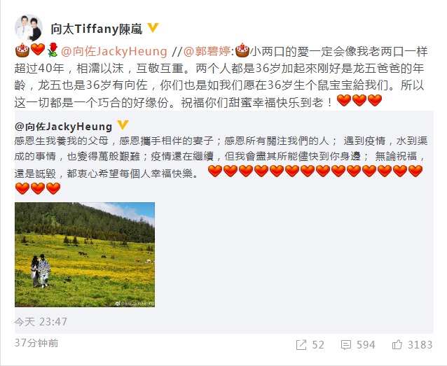 Vào đêm 20/7, đúng khoảnh khắc trước thềm bước sang tuổi mới, Hướng Tả - con trai trùm mafia Hướng Hoa Cường - đã đăng tải bức ảnh chụp cùng bà xã minh tinh Quách Bích Đình kèm theo lời nhắn: "Cảm tạ công ơn sinh thành của cha mẹ, cảm ơn vợ đã luôn sát cánh bên anh. Cảm ơn tất cả những người đã quan tâm đến gia đình chúng tôi.