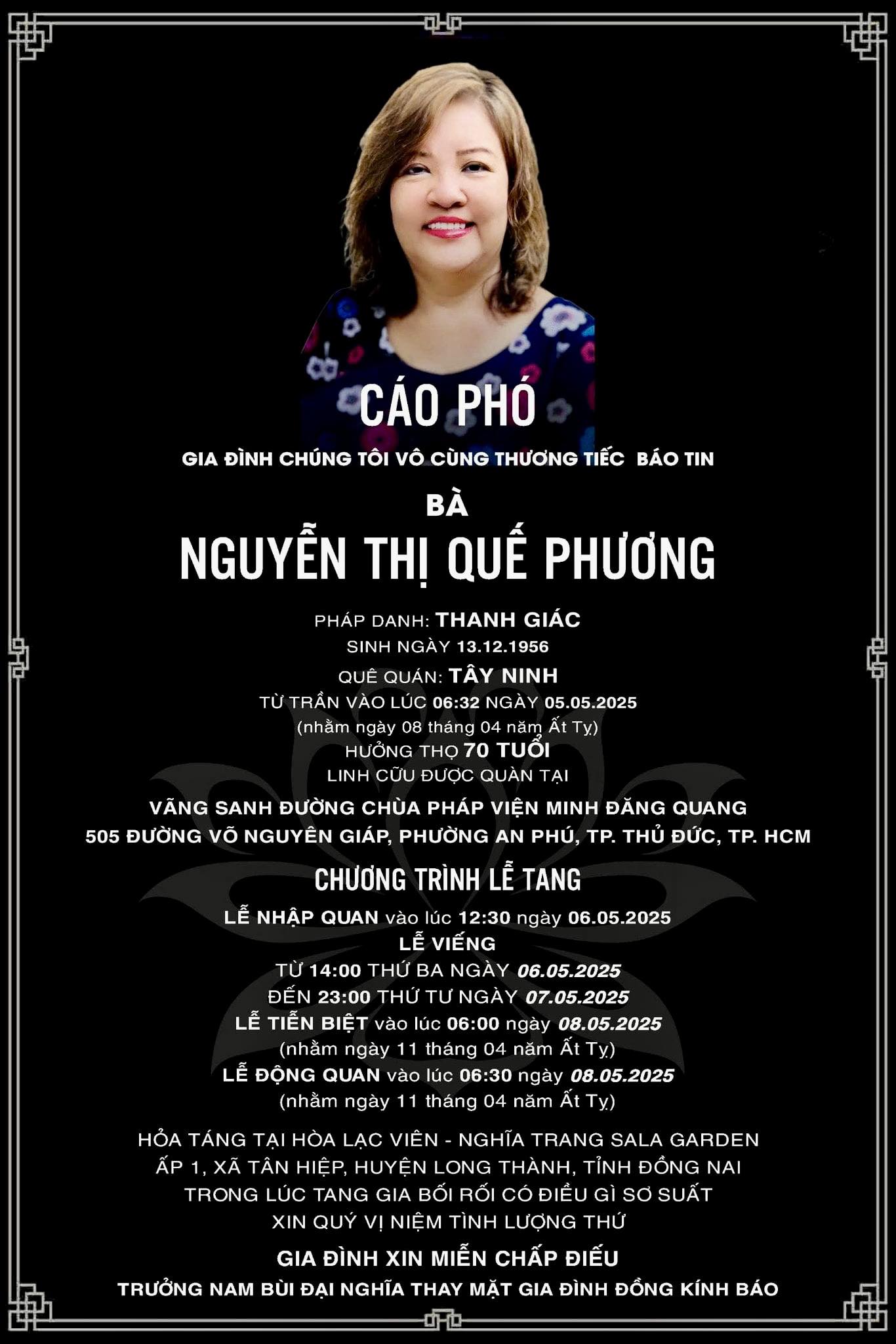 Theo thông tin trên cáo phó, mẹ MC Đại Nghĩa qua đời vào lúc 6h32 sáng 5/5. Tang lễ sẽ được tổ chức tại Pháp viện Minh Đăng Quang (TP. Thủ Đức), lễ viếng bắt đầu từ 14h ngày 6/5, sau đó linh cữu sẽ được an táng tại nghĩa trang ở Đồng Nai vào sáng 8/5.