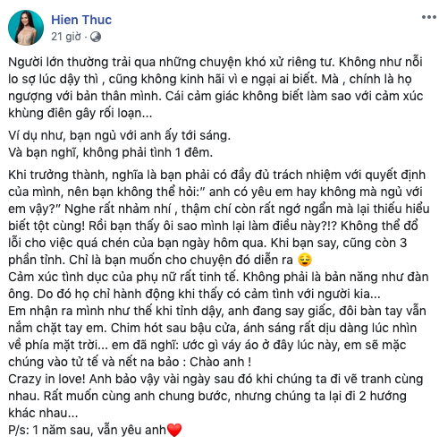 Đây cũng là lần đầu tiên sau nhiều năm, Hiền Thục bất ngờ chia sẻ về tình cảm cá nhân của mình. Trong chia sẻ, Hiền Thục cho hay cô rất muốn chung bước cùng người đàn ông đó nhưng mọi chuyện lại không diễn ra như vậy, hai người lại đi 2 hướng khác nhau. Cuối cùng Hiền Thục thừa nhận sau 1 năm, cô vẫn rất yêu người đó.