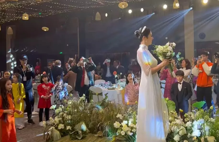 Một trong những diễn biến được chờ đợi ở đám cưới là màn tung hoa của cô dâu Ngọc Hân. Nhiều trai xinh gái đẹp hào hứng tham gia "tiết mục" này, và may mắn đã gọi tên người mẫu Hồng Quế.