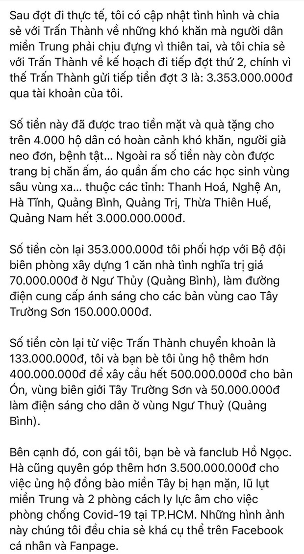 Sau đợt đi thực tế, tôi có cập nhật tình hình và chia sẻ với Trấn Thành về những khó khăn mà người dân miền Trung phải chịu đựng vì thiên tai, và tôi chia sẻ với Trấn Thành về kế hoạch đi tiếp đợt thứ 2, chính vì thế Trấn Thành gửi tiếp tiền đợt 3 là: 3.353.000.000 đồng qua tài khoản của tôi.
