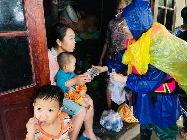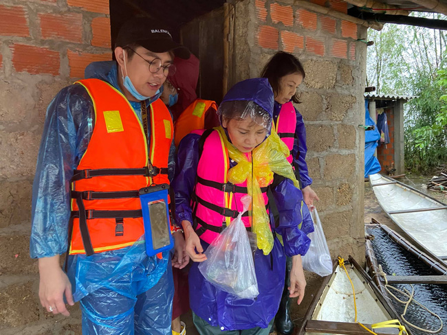 Trên trang cá nhân, mẹ Hà Hồ thông báo đã tiếp cận được xã ngập sâu nhất huyện Hải Lăng sau 40 phút đi thuyền. Sau đó bà tiếp tục lội nước đến từng nhà trao đồ ăn, tiền mặt cho người dân.