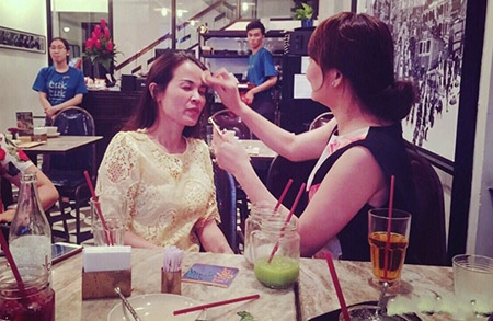 | Mẹ Kỳ Duyên trổ tài trang điểm "giúp đỡ" mẹ của Á Hậu Tú Anh trong một lần hội ngộ. |