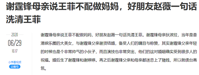 Theo nhiều nguồn tin, Vương Phi không được lòng mẹ Tạ Đình Phong - bà Địch Ba Lạp. Vốn là ngôi sao nổi tiếng xinh đẹp một thời của làng giải trí Hong Kong, bà Địch Ba Lạp còn được biết đến với tính cách đanh đá, chua ngoa. Trước đây, khi làm dâu nhà họ Tạ, một người hiền thục như Trương Bá Chi cũng từng bị mẹ chồng thẳng tay bạt tai trong một lần mâu thuẫn.