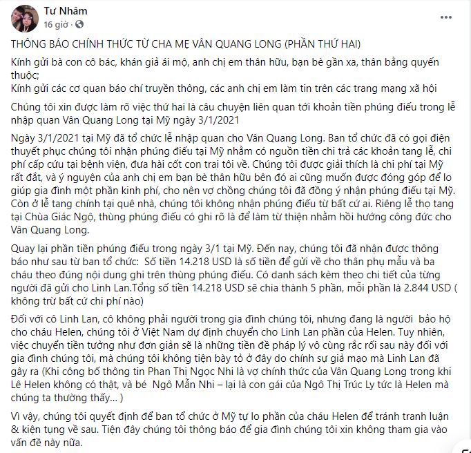 Những ngày gần đây, dư luận đang vô cùng xôn xao về sự việc mẹ ruột của cố NS Vân Quang Long lên tiếng tố cáo Linh Lan tự nhận là vợ của nam ca sĩ. Cô còn bị tố dùng tên của chị gái ruột là Phan Thị Ngọc Nhi thay vì tên thật Ngô Thị Trúc Ly, bé Helen Lê cũng được thay đổi tên trong thời gian gần đây. Gia đình đã liên hệ với cơ quan chức năng để xác minh lại nhân thân của Linh Lan, khẳng định vợ hiện tại của NS Vân Quang Long là 1 người phụ nữ khác đang sinh sống ở Mỹ. Cho đến tối 21/4, mẹ của Vân Quang Long tiếp tục đăng tải dòng trạng thái dài chia sẻ về loạt ồn ào này.