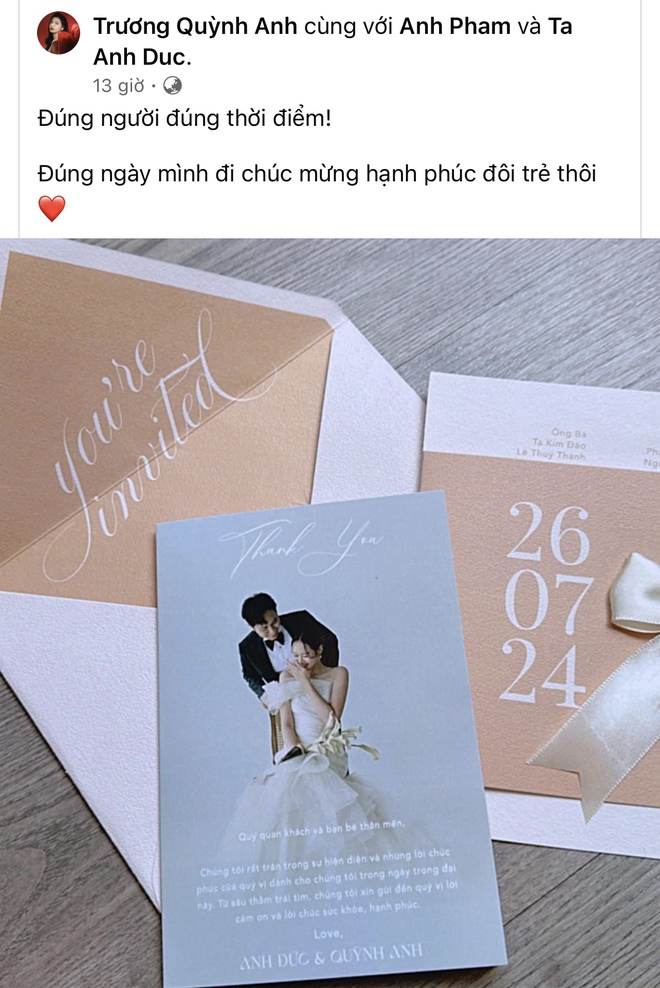 Trước đó, cặp đôi hoàn toàn giấu chuyện hẹn hò với công chúng. Nam diễn viên cho biết, sau khi Quỳnh Anh nhận lời cầu hôn, anh mới chia sẻ chuyện tình cảm công khai. Những ngày vừa qua, cặp đôi thường xuyên cập nhật công tác chuẩn bị hôn lễ. Được biết, Anh Đức và Quỳnh Anh đã hoàn tất việc gửi thiệp mời cho quan khách.