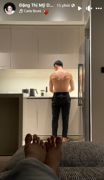Trên trang cá nhân, Midu vừa cập nhật hình ảnh cô nằm trên giường và theo dõi ông xã đang đứng bếp. Thiếu gia Minh Đạt cởi trần phần thân trên, khoe tấm lưng rộng, cơ bắp săn chắc vô cùng gợi cảm.