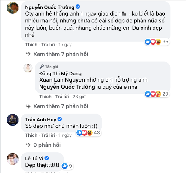 Ngay dưới phần bình luận, dàn sao Vbiz đã trầm trồ vì độ giàu có "không phải dạng vừa đâu" của Midu. Đặc biệt, doanh nhân như Quốc Trường cũng bất ngờ: "Công ty anh một ngày giao dịch bao nhiêu lần nhưng chưa thấy cái số nào phân nửa số này luôn, buồn quá. Chúc mừng em Du xinh đẹp nhé".