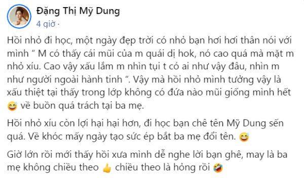 "Hồi nhỏ xíu còn lợi hại hại hơn, đi học bạn chê tên Mỹ Dung sến quá. Về khóc mấy ngày tạo sức ép bắt ba mẹ đổi tên. Giờ lớn rồi mới thấy hồi xưa mình dễ nghe lời bạn ghê, may là ba mẹ không chiều theo, chiều theo là hỏng rồi".
