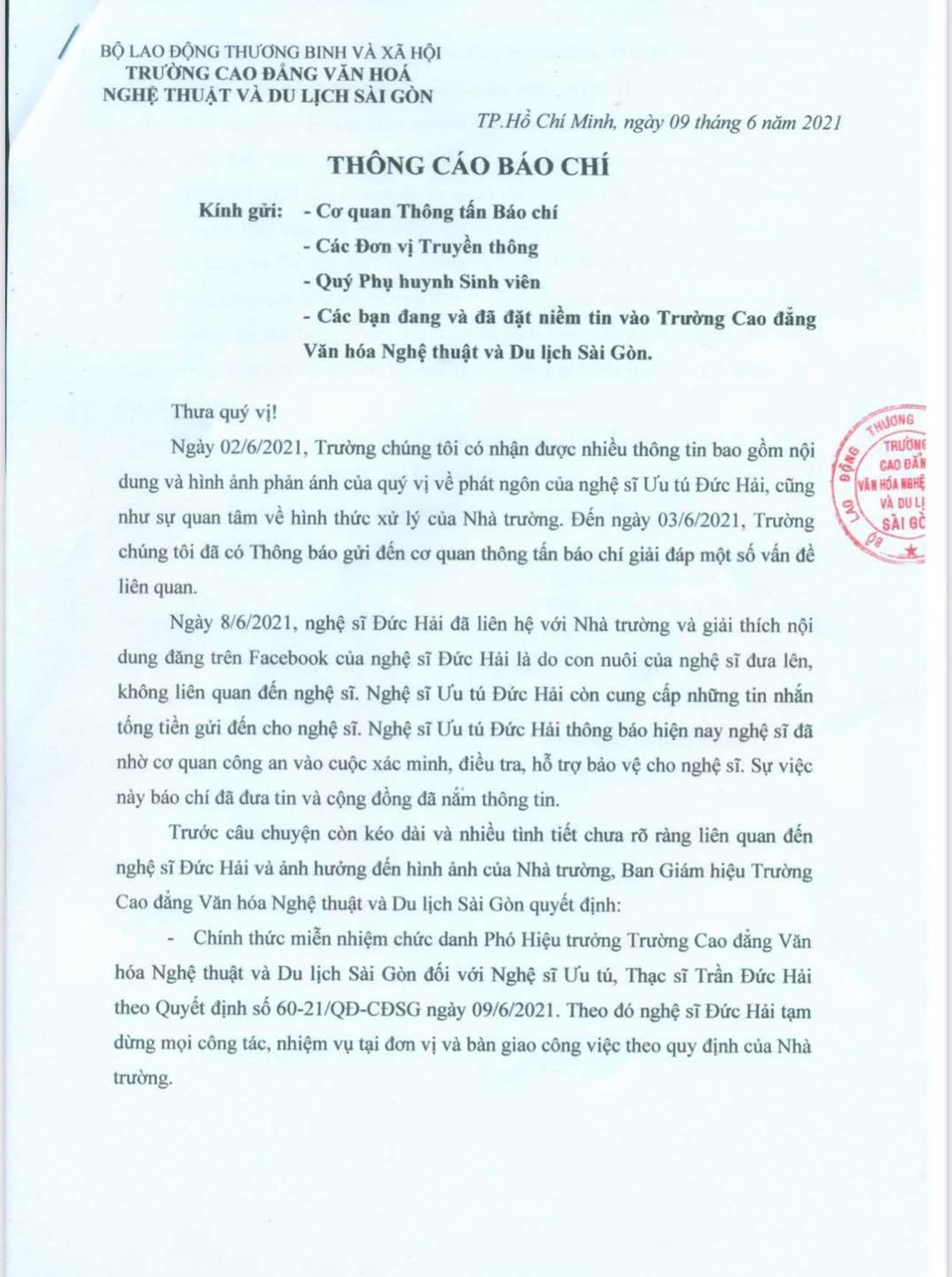 Trước đó ngày 3/6, Trường Cao đẳng Văn hóa Nghệ thuật và Du lịch Sài Gòn thông báo sẽ xem xét và sẽ có hình thức kỷ luật phù hợp nếu những phản ánh về NSƯT Đức Hải là đúng. Phía nhà trường cho biết cũng đã tiếp nhận thông tin NSƯT Đức Hải bị mất quyền kiểm soát tài khoản Facebook dẫn đến sự cố đáng tiếc.