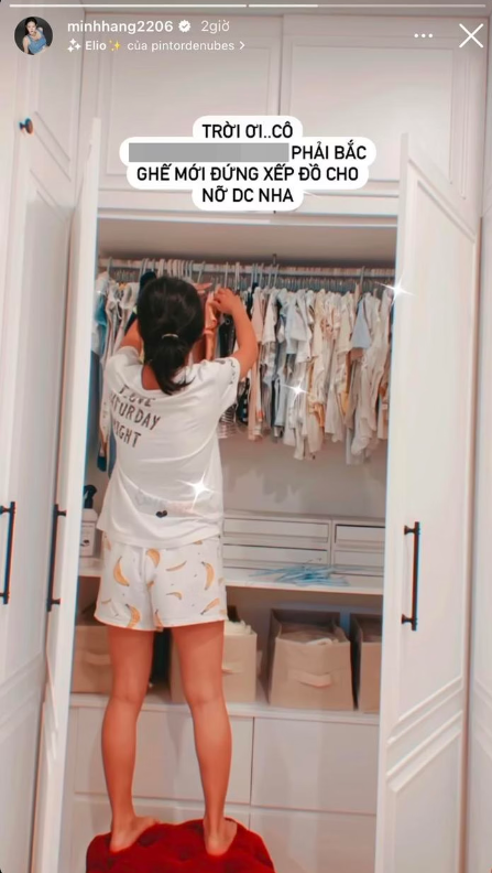 Minh Hằng viết: "Trời ơi, cô phải nhấc ghế mới đứng xếp được đồ cho Mỡ được nha". Thông qua những hình ảnh, có thể thấy dù chỉ mới chưa tròn 1 tháng tuổi, tủ đồ của quý tử nhà Minh Hằng đã đầy kín, khiến nhiều khán giả trầm trồ.