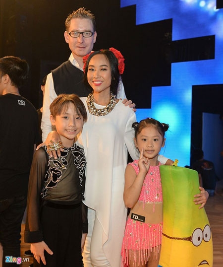 Diễn viên Mai Thu Huyền đưa các con đến cổ vũ một thí sinh của đội Thủy Tiên. |