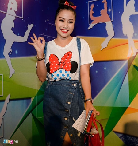 MC Ốc Thanh Vân diện trang phục xì tin, năng động. |