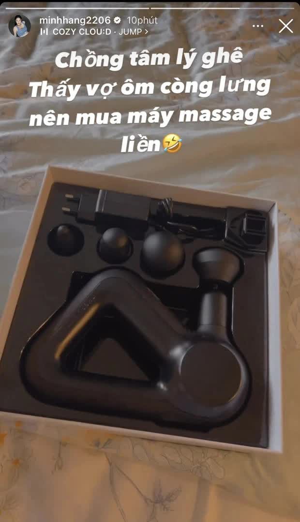 Trước đó, người đẹp sinh năm 1987 đã hạnh phúc chia sẻ khi được ông xã tặng máy massage dù không phải nhân dịp gì. Cô cho biết vì chồng nhận thấy vợ "còng lưng" nên đã mua tặng và không quên khen ông xã của mình tâm lý.
