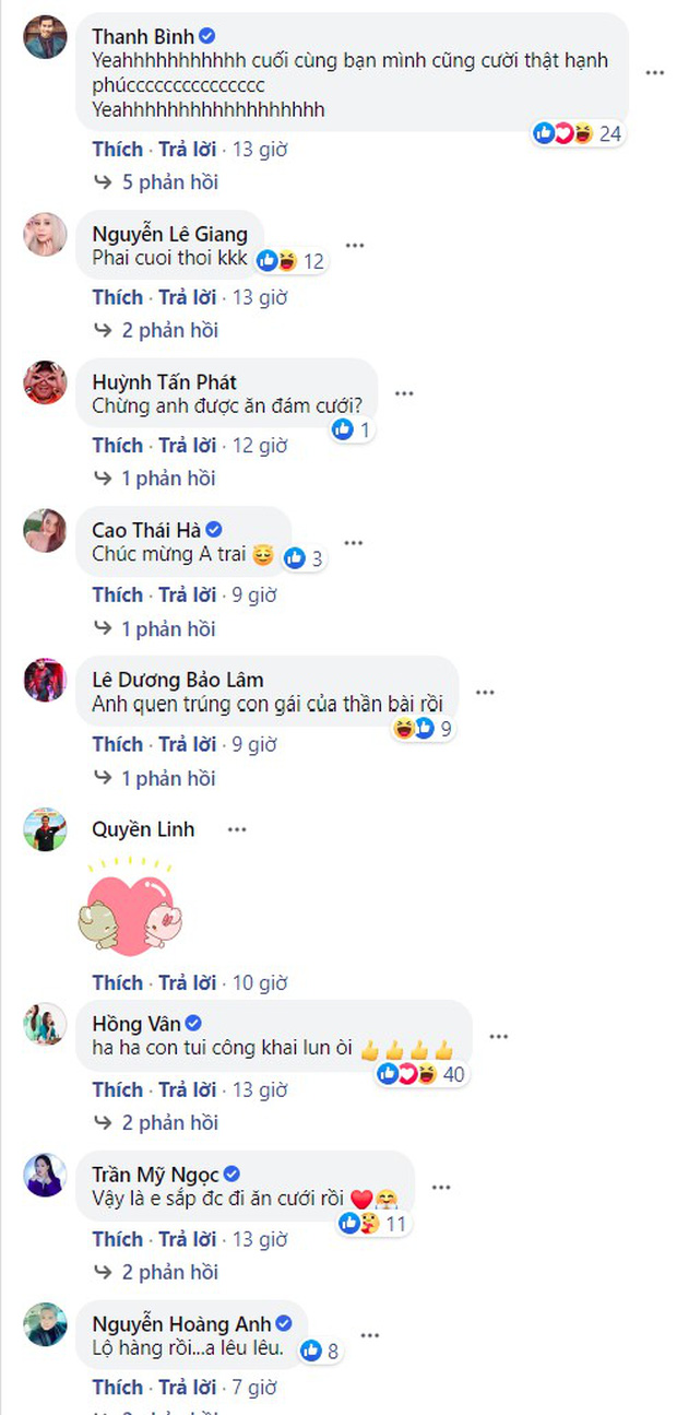 Ngay khi vừa mới chia sẻ loạt ảnh tình tứ cùng bạn gái được ít phút, cặp đôi đã nhận được lia lịa lời chúc mừng từ dàn sao Vbiz gồm nghệ sĩ Hồng Vân, MC Quyền Linh, Hoàng Anh, Thanh Bình... Ai cũng hân hoan, dành những lời chúc tốt đẹp nhất tới Minh Luân và Thiên Hương.