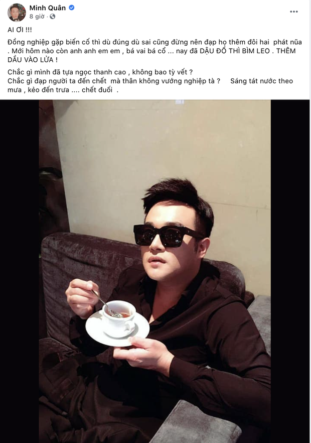 Mới đây, ca sĩ Minh Quân cũng đăng tải một dòng trạng thái đầy ẩn ý về chuyện anh em đồng nghiệp "thêm dầu vào lửa" khi một người gặp biến cố. Cụ thể, anh viết trên trang cá nhân: "Ai ơi, đồng nghiệp gặp biến cố thì dù đúng dù sai cũng đừng nên đạp họ thêm phát nữa. Mới hôm nào còn anh anh em em, bá vai bá cổ... nay đã dậu đổ bìm leo, thêm dầu vào lửa! Chắc gì mình đã tựa ngọc thanh cao, không bao tỳ vết? Chắc gì đạp người ta đến chết mà thân không vướng nghiệp? Sáng tát nước theo mưa, kẻo đến trưa chết đuối".