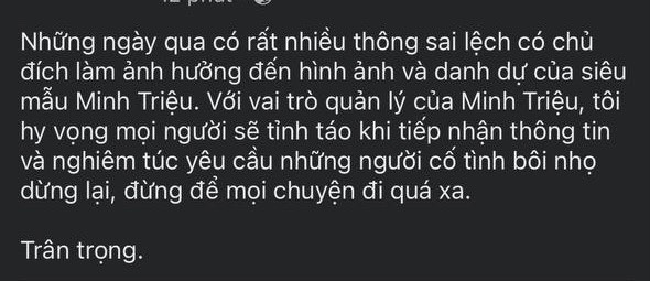 Trước hàng loạt thông tin tiêu cực hướng đến Minh Triệu, tối 29/2, quản lý của cô đã lên tiếng về vụ việc. "Những ngày qua có rất nhiều thông sai lệch có chủ đích làm ảnh hưởng đến hình ảnh và danh dự của siêu mẫu Minh Triệu. Với vai trò quản lý của Minh Triệu, tôi hy vọng mọi người sẽ tỉnh táo khi tiếp nhận thông tin và nghiêm túc yêu cầu những người cố tình bôi nhọ dừng lại, đừng để mọi chuyện đi quá xa", đại diện của Minh Triệu viết trên trang cá nhân.