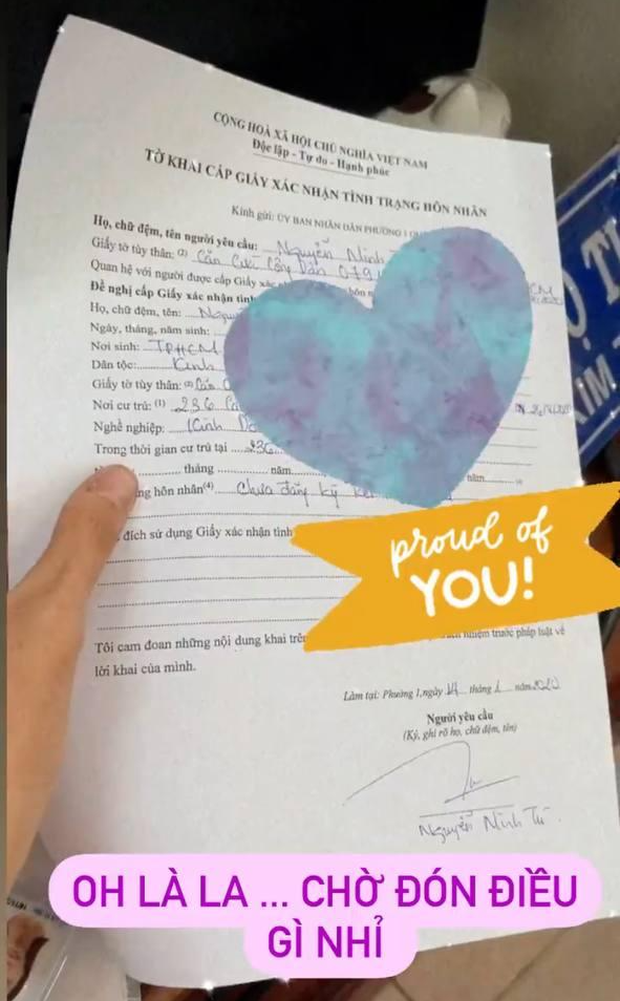 Mới đây, Minh Tú bất ngờ chia sẻ hình ảnh chụp giấy xác nhận tình trạng hôn nhân, kèm theo đó là dòng chú thích đầy úp mở: "Oh la la... Chờ đón điều gì nhỉ?", phía trên là nhãn dán kèm dòng chữ: "Proud of you" (Tự hào về bạn).