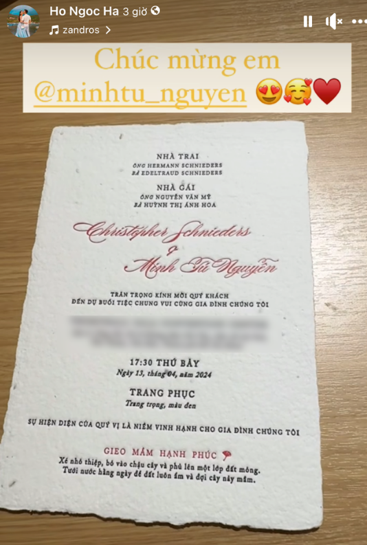 Trong bức ảnh khoe thiệp cưới Minh Tú mà Hồ Ngọc Hà đăng tải vào tối 24/3, nhiều người đã nhận ra nhiều chi tiết khác lạ. Theo đó, nữ siêu mẫu đã dùng giấy tái chế để tạo nên toàn bộ thiệp cưới độc đáo của mình, đồng thời cũng lưu ý cho khách mời là diện trang phục trang trọng và có màu đen.