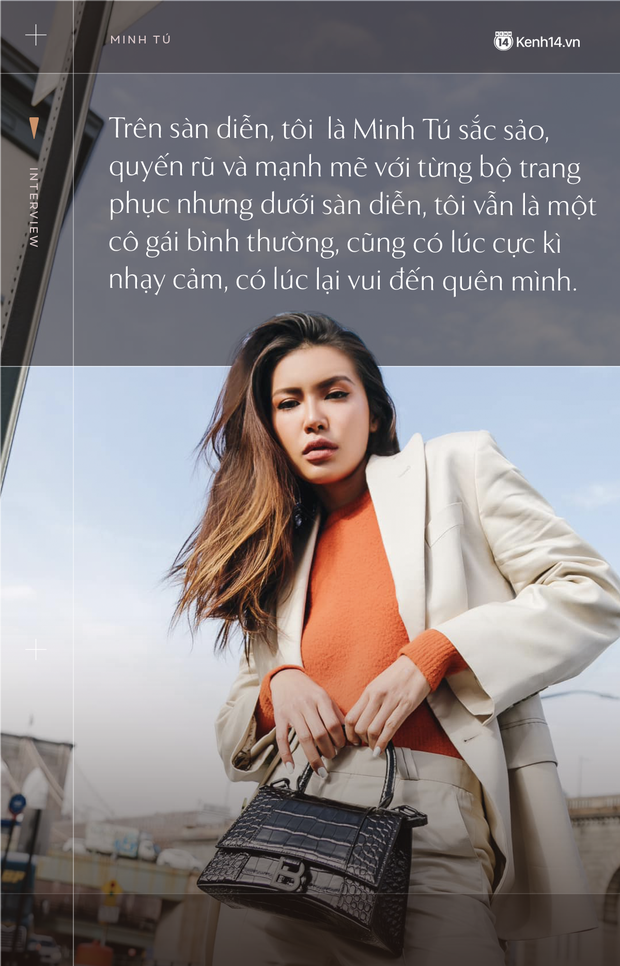 Tôi là siêu mẫu trên sàn diễn nhưng vẫn là Minh Tú ở cuộc sống hằng ngày mà. Có thể trên sàn diễn, tôi sắc sảo, quyến rũ hay mạnh mẽ với từng bộ trang phục nhưng Minh Tú dưới sàn diễn vẫn là một cô gái bình thường như bao cô gái khác, cũng có lúc cực kì nhạy cảm, cũng có lúc lại vui đến quên mình. Mà hơn hết, từ trước đến giờ, tôi đến với khán giả bằng hình ảnh chân thật, có sao sống vậy nên mọi người sẽ hiểu được điều này thôi.