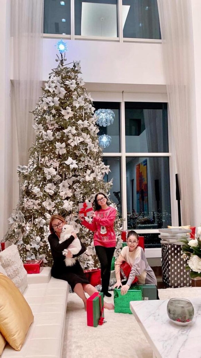 Vào đêm giáng sinh, chị em Minh Tuyết - Hà Phương đều chọn những bộ đầm cocktail màu sắc nổi bật. Hà Phương diện váy xòe đắp ren, đính pha lê điệu đà. Minh Tuyết sexy với đầm đỏ hở ngực, ôm sát cơ thể. 2 chị em vui vẻ trò chuyện cũng như tìm nhiều góc ‘sống ảo' trong dinh thể để chụp ảnh kỷ niệm.