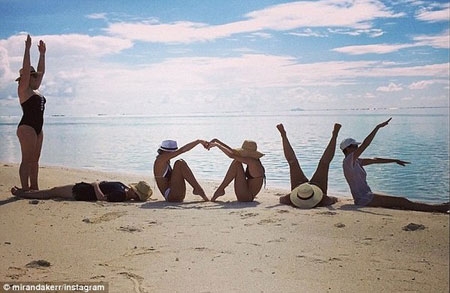 Miranda Kerr vui đùa cùng các cô bạn và tạo dáng hình chữ "love" trên biển |