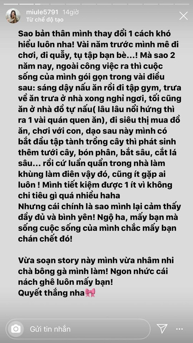 Đặc biệt hơn, mới đây Miu Lê còn bất ngờ chia sẻ về lối sống hiện tại đã thay đổi 180 độ so với 2 năm trước. Cụ thể, nữ ca sĩ "Còn thương em thì không để cho em khóc" kể: "Sao bản thân mình thay đổi khó hiểu luôn ấy, vài năm trước mê đi chơi, đi quẫy, tụ tập bạn bè mà 2 năm nay cuộc sống gói gọn trong vài điều". Không chỉ bỏ những thói quen cũ, Miu Lê còn bật mí cô tiết kiệm được 1 khoản kha khá nhờ những việc làm như trồng rau, tự nấu ăn tại gia và dành thời gian tập luyện nâng cao sức khoẻ thay vì vui chơi xa xỉ.