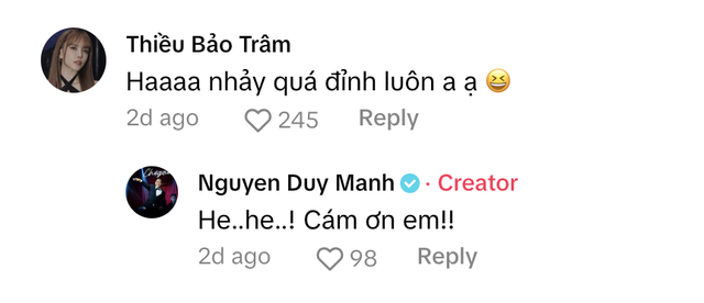 Đáng chú ý, bên dưới phần bình luận, Thiều Bảo Trâm còn có tương tác với nam ca sĩ Duy Mạnh. Theo đó, cô dành lời khen cho đàn anh: “Nhảy quá đỉnh luôn anh ạ”. Đáp lại phản ứng của Thiều Bảo Trâm, Duy Mạnh gửi lời cảm ơn nữ ca sĩ: “Hehe, cảm ơn em”. Việc Thiều Bảo Trâm và Duy Mạnh có mối quan hệ thân thiết và thoải mái tương tác với nhau khiến không ít người bất ngờ.