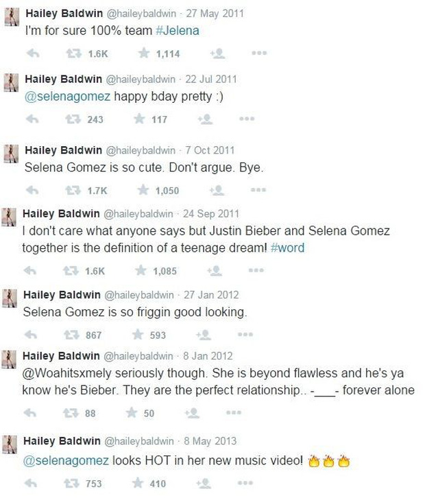Baldwin từng là fan cuồng ship Jelena và đã vô số lần bày tỏ lòng hâm mộ đối với Selena Gomez từ những năm 2011 đến 2013. Cư dân mạng đã đào lại được không ít dòng trạng thái thể hiện tình yêu vô bờ của Hailey đối với Selena và cặp đôi Jelena.