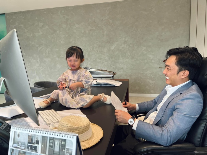 Trong ảnh, Cường Đô La ngồi trên ghế thì bé Suchin lại trèo hẳn lên bàn, tuy vậy thần thái của cô công chúa nhỏ lại vô cùng "sang chảnh", ra dáng nữ CEO vô cùng!