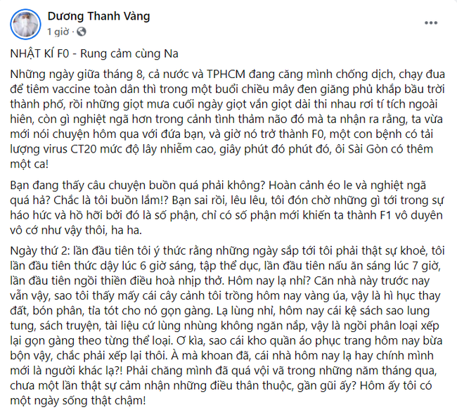 Mới đây, diễn viên hài Dương Thanh Vàng bất ngờ thông báo bị nhiễm Covid-19 và chia sẻ hành trình hơn 20 ngày chống chọi với căn bệnh này. Nam diễn viên trở thành F0 sau khi tiếp xúc với một người bạn dương tính với Covid-19. Tuy nhiên, Dương Thanh Vàng lại đối diện với tình huống này bằng tinh thần vô cùng lạc quan, không lo sợ.