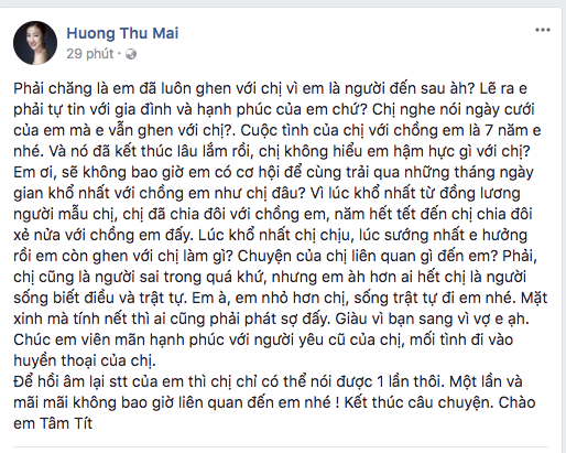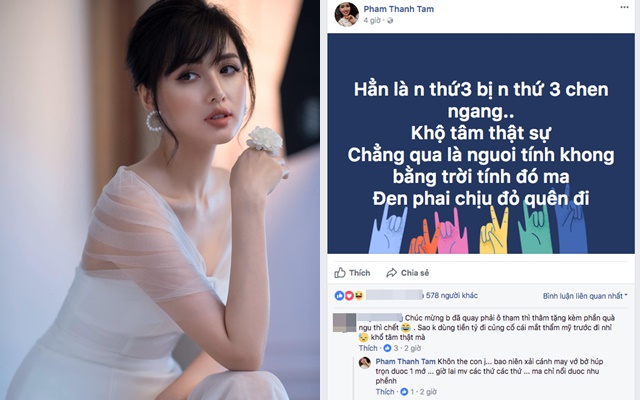 Đúng thời điểm chia sẻ của Maya gây chú ý, hot girl Tâm Tít đăng ngay status ẩn ý: "Hẳn là người thứ 3 bị người thứ 3 chen ngang. Khổ tâm thật sự. Chẳng qua người tính không bằng trời tính đó mà, đen phải chịu, đỏ quên đi". Dân tình lập tức cho rằng Tâm Tít đang ám chỉ Maya, bởi chồng của cô là bạn trai cũ của người đẹp này.