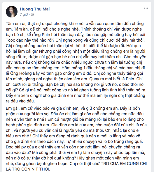 Maya sau đó gọi thẳng tên Tâm Tít và đáp trả thẳng thắn: "Cuộc tình của chị với chồng em là 7 năm em nhé. Và nó đã kết thúc lâu lắm rồi, chị không hiểu em hậm hực gì với chị? Em ơi, sẽ không bao giờ em có cơ hội để cùng trải qua những tháng ngày gian khổ nhất với chồng em như chị đâu? Vì lúc khổ nhất từ đồng lương người mẫu chị, chị đã chia đôi với chồng em, năm hết tết đến chị chia đôi xẻ nửa với chồng em đấy. Lúc khổ nhất chị chịu, lúc sướng nhất em hưởng rồi em còn ghen với chị làm gì?".
