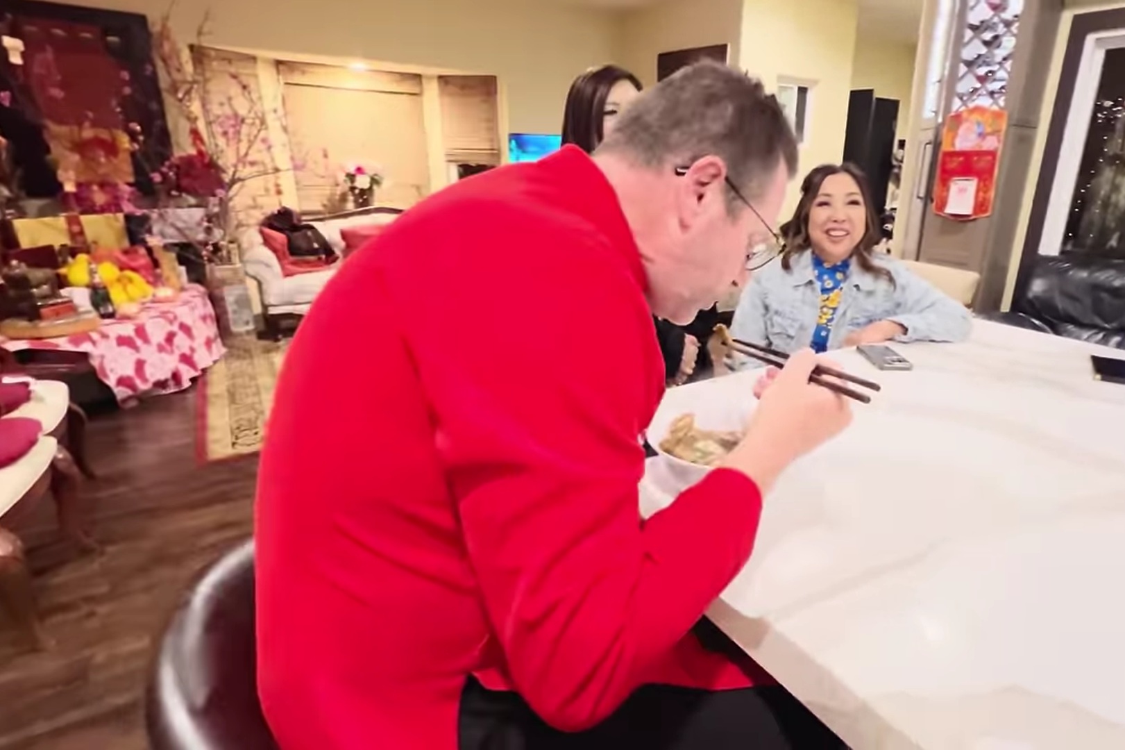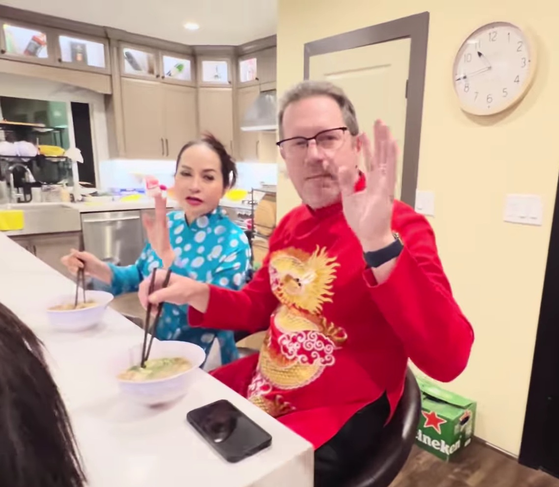 Chồng Tây của nghệ sĩ Kim khiến mọi người không khỏi bất ngờ khi mặc áo dài đỏ đậm chất truyền thồng Việt, ăn được hầu hết các món ăn Việt Nam, ngồi ăn cả trứng canh bún măng vịt ngon lành.