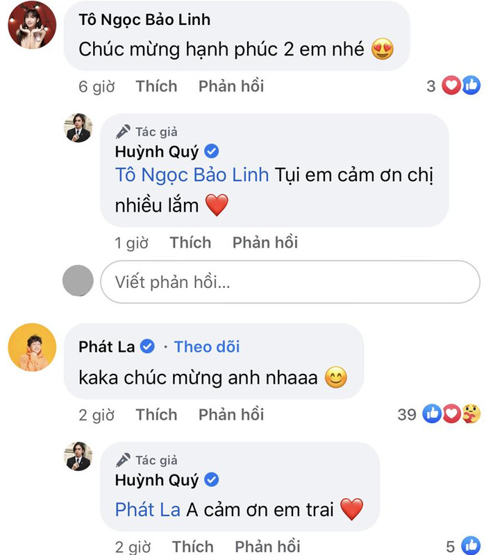 Bên dưới bài đăng của Huỳnh Quý, rất nhiều nghệ sĩ như như Lâm Vỹ Dạ, Thuý Diễm, Lynk Lee, Mạc Văn Khoa,... đã để lại bình luận chúc mừng cũng như bày tỏ sự bất ngờ, bởi anh chàng không chia sẻ nhiều về chuyện tình cảm trên mạng xã hội.