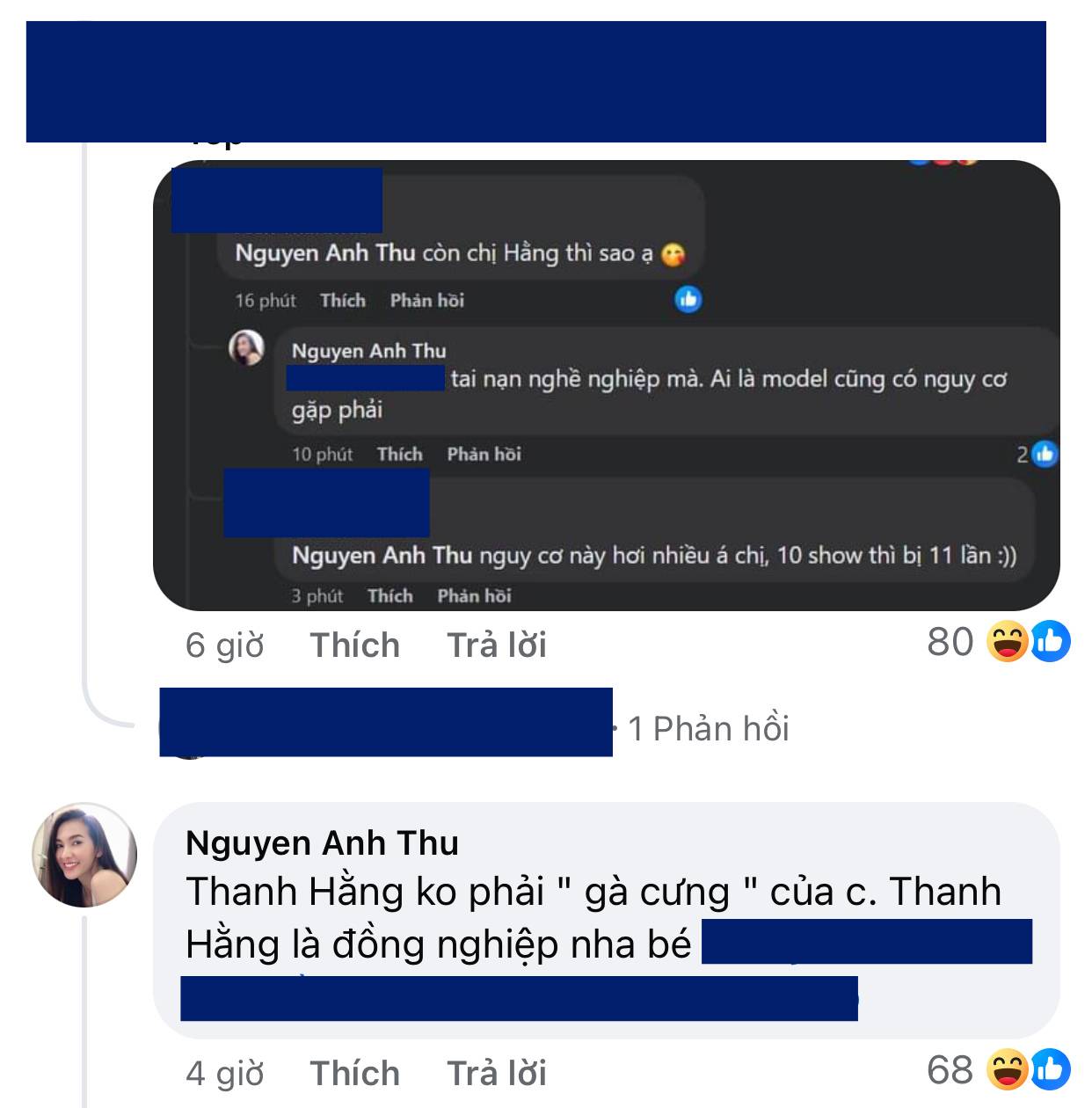 Theo đó, khi có netizen hỏi cảm nghĩ về phần trình diễn của Thanh Hằng, Anh Thư đã đưa ra ý kiến: "Đây chỉ là tai nạn nghề nghiệp. Ai làm người mẫu cũng có nguy cơ gặp phải". Màn lên tiếng bênh vực đàn em của Anh Thư thu hút sự bàn tán của cư dân mạng. Trong số đó, một tài khoản MXH đã để lại bình luận bóng gió: "Cũng sợ TH phong sát, đâu dám ho".