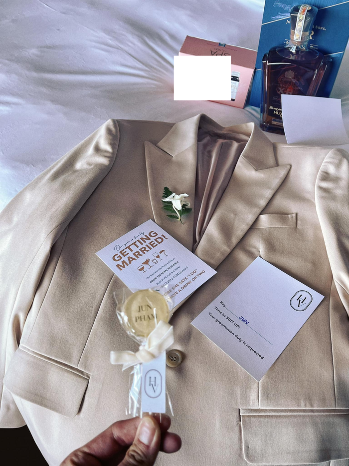 Được biết, ngoài tham gia tiệc cưới Jun Phạm còn nhận được sự tín nhiệm của "đả nữ" khi anh vinh dự trở thành rể phụ trong đám cưới. Nam ca sĩ đã hào hứng chia sẻ sự quan tâm của cặp đôi dành cho rể phụ: "Về phòng đã thấy chiếc áo của rể phụ vừa vặn nằm trên giường - chạy đâu cho thoát! Nước uống collagen dưỡng để mai thiệt đẹp và chai rượu mạnh để hiểu".