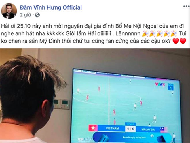 Đăng tải hình ảnh chụp chung với Quang Hải, Đàm Vĩnh Hưng viết: "Hải ơi, ngày 25/10, anh mời đại gia đình gồm bố mẹ, nội ngoại của em đi nghe anh hát nha. Giỏi lắm! Tôi không chen ra sân Mỹ Đình thôi chứ tôi cũng fan cứng của các cậu".